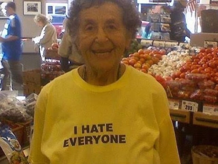 This grandmother seems to be like any other nice grandmother who would never harm a fly, but a closer examination of her clothing reveals that something isn’t quite right. Oh no, your kind and caring granny despises everyone?