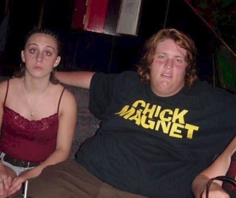 In this instance, he’s wearing a shirt that reads ‘chick magnet,’ and given the fact that there’s a really gorgeous female sitting next to him, we suppose it’s technically accurate.